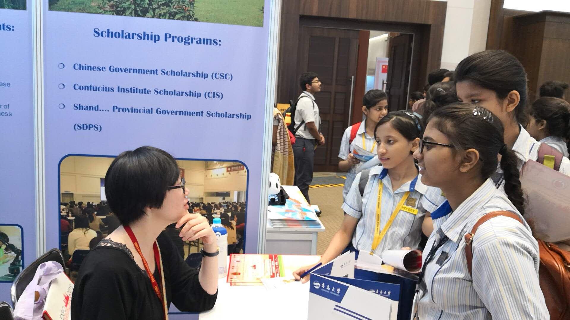 展会期间,我方参展老师热情接待了印方师生及家长,向他们介绍了中国文化历史,宣传了中国高等教育发展最新成就,介绍了我校的地理位置、办学特色、学科专业和外国学生招收专业设置、奖学金政策及相关费用收取标准,并就学生们感兴趣的问题进行了详尽解答 很多印度学生和家长表达了来我校留学的愿望。