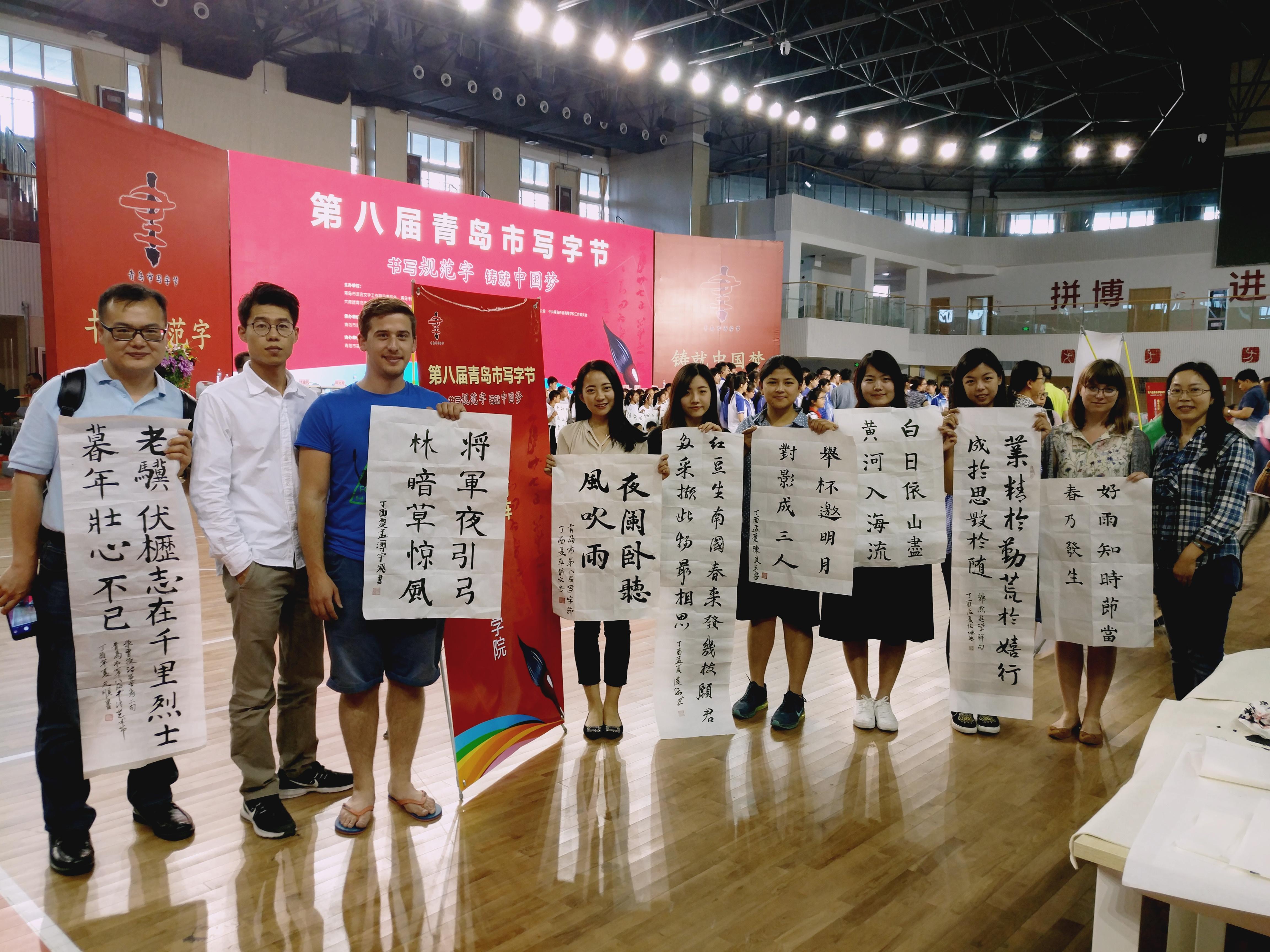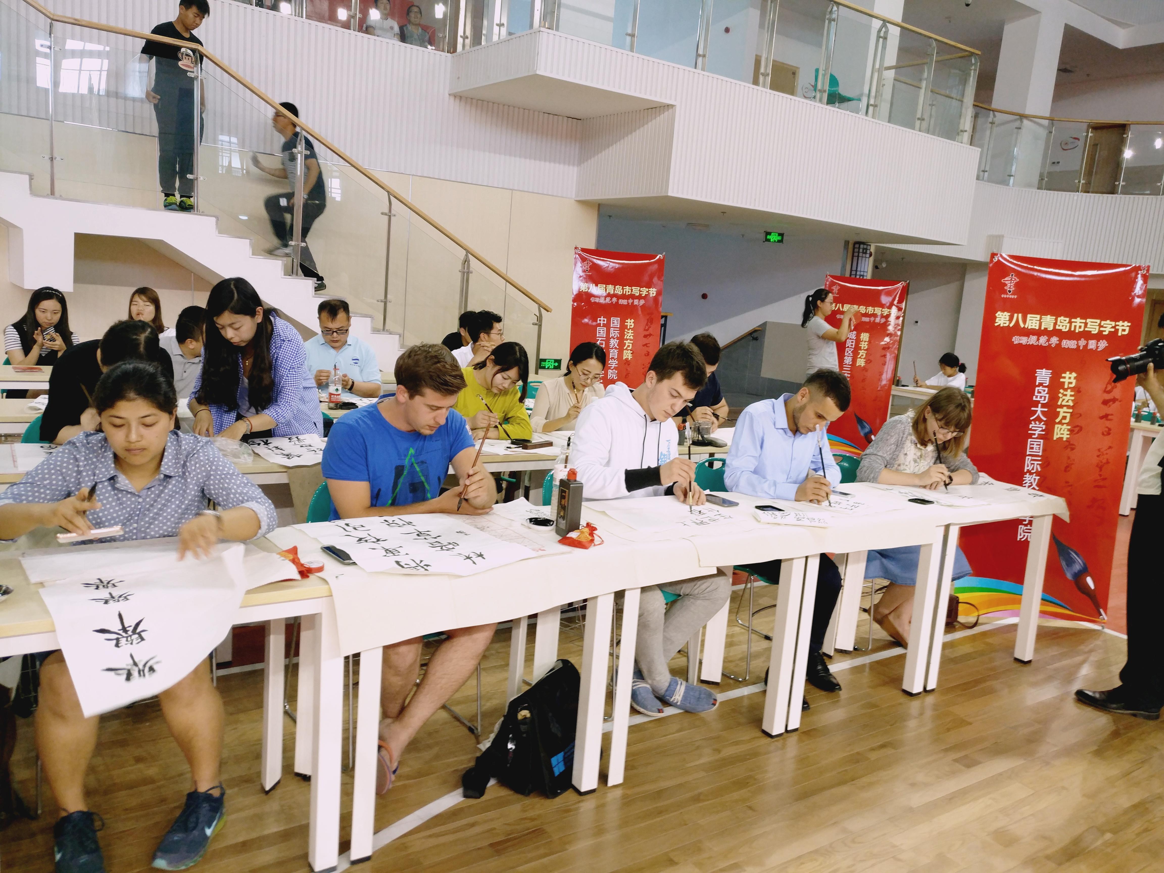 6月5日下午,英国bet365体育留学生和汉语国际教育硕士组队参加了在青岛实验高中举行的第八届青岛市写字节,本次活动由青岛市语委、青岛市教育局联合举办,同学们与来青岛16中学生、青岛市实验高中学生、中国石油大学留学生以及青岛市北区书法骨干教师们一起进行了现场书写展示。